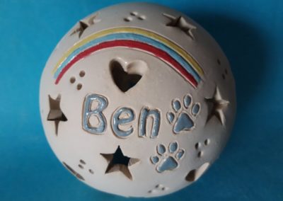 Pfoten und ein Regenbogen verzieren die weiße Tonkugel. Schriftfarbe: Rosa. Leuchtmotive: Herzen und Sterne.