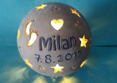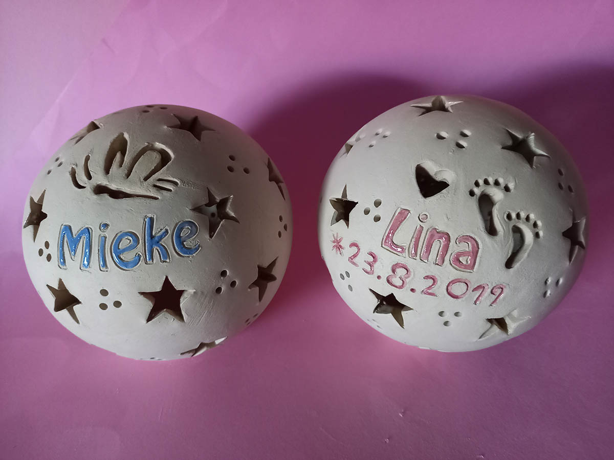 Als zusätzliche Motive können Füßchen, (eingraviert oder ausgeschnitten, das Paar 3,50 €), Händchen oder Pfötchen (eingraviert (das Paar 3,50 €) oder ein Schmetterling (ausgeschnitten, 5 €) ausgewählt werden. Auch ein Regenbogen kann in verschiedenen Farben integriert werden (1,00 € pro Farbe). Der Durchmesser beträgt ca. 12 cm. Die Kugel wird mit einem Teelicht geliefert (Achtung: Kugel kann heiß werden) und kann alternativ mit einer Lichhterkette beleuchtet werden (nicht im Lieferumfang enthalten). Auf Nachfrage kann die Kugel auch in den Tonfarben Anthrazit, Terracotta oder Grau angefertigt werden. Leichte Farbabweichungen in der Tonfarbe oder Glasur können immer vorkommen und sind kein Grund zur Reklamation!